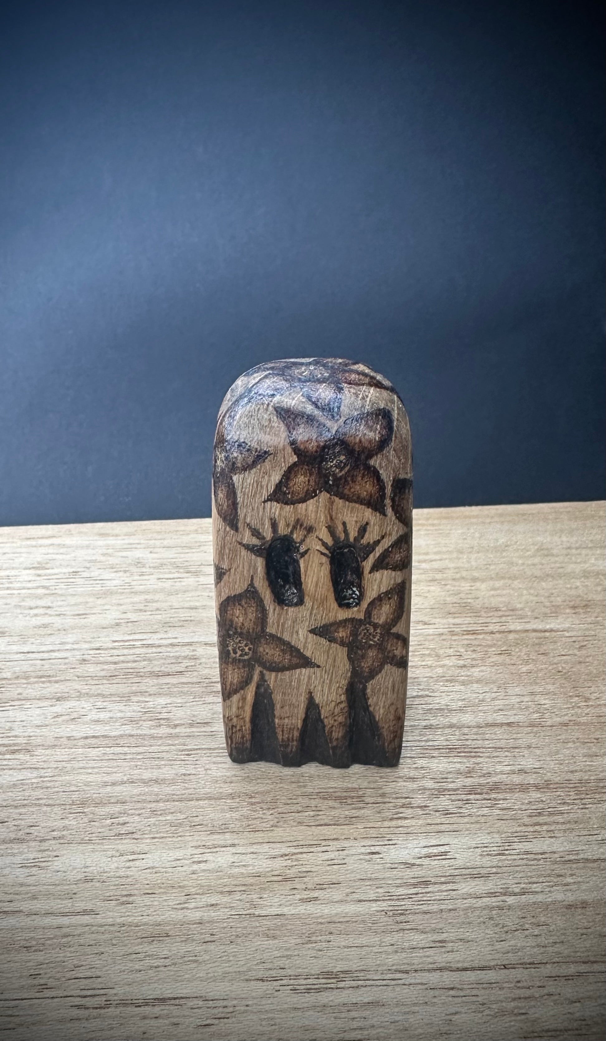 Hand burnt, sealed with osmo and then waxed to give it a lovely shine. All our sealants are environmentally friendly and all our wood is sustainably sourced.