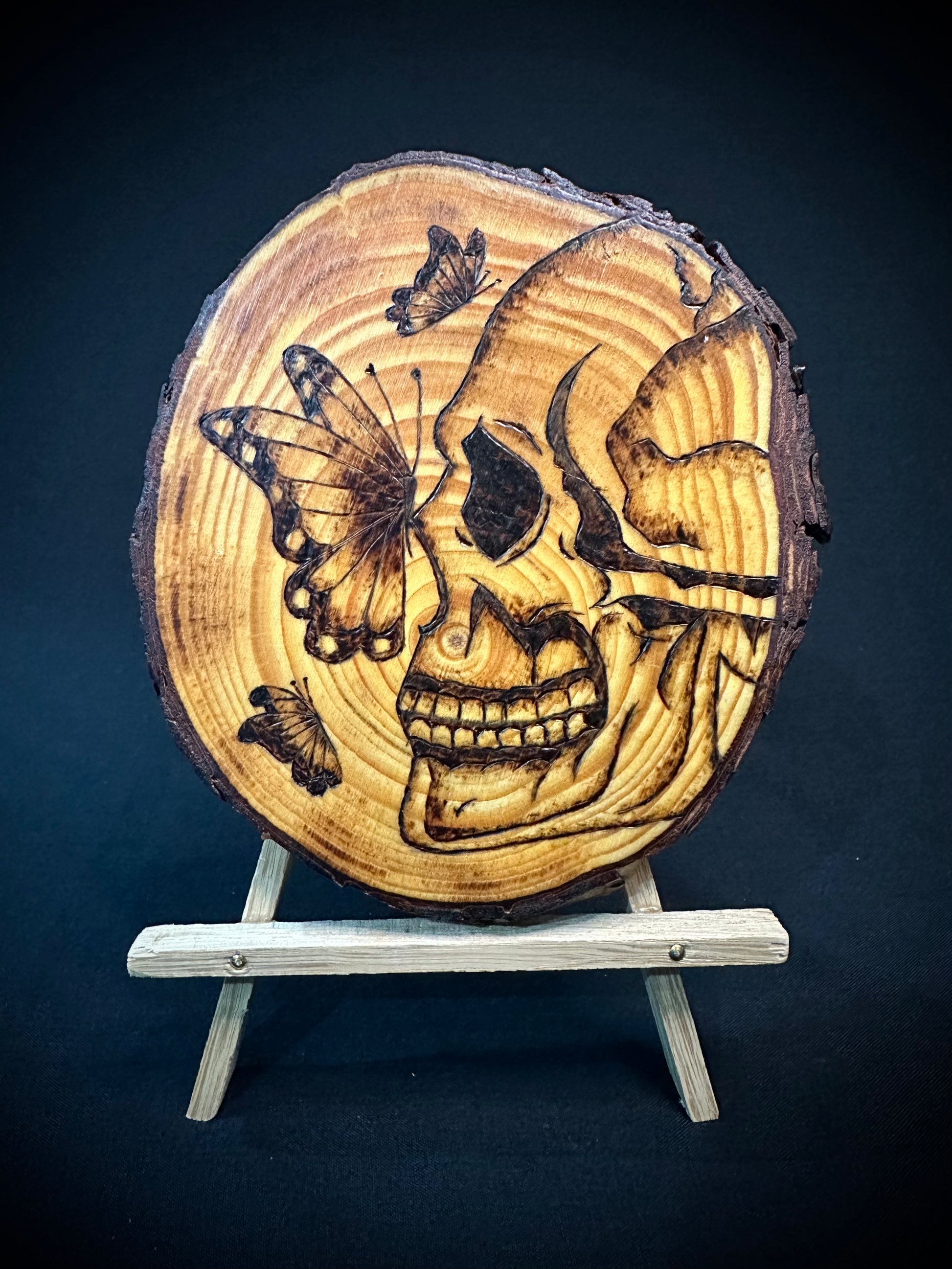 This handcrafted round wood piece, known as Butterfly Nose, features a natural bark design and is coated in a clear Osmo satin finish with UV protection. Free of biocides, it is safe for humans, plants, and animals. Add a touch of nature to your space with this unique piece of art