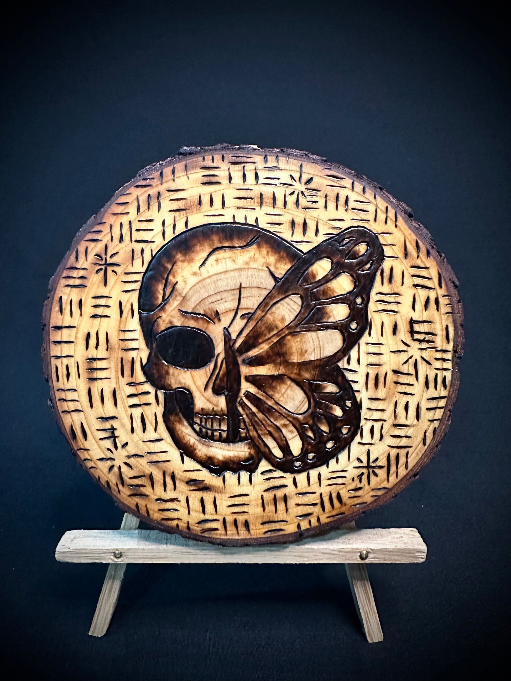 This handcrafted round wood piece, known as Butterfly Skull, features a natural bark design and is coated in a clear Osmo satin finish with UV protection. Free of biocides, it is safe for humans, plants, and animals. Add a touch of nature to your space with this unique piece of art.