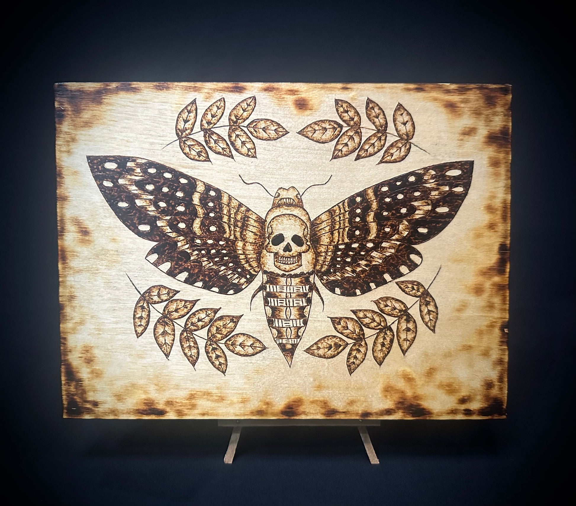 Birch and pinewood canvas. A hand designed and burnt artwork named Flying Death.