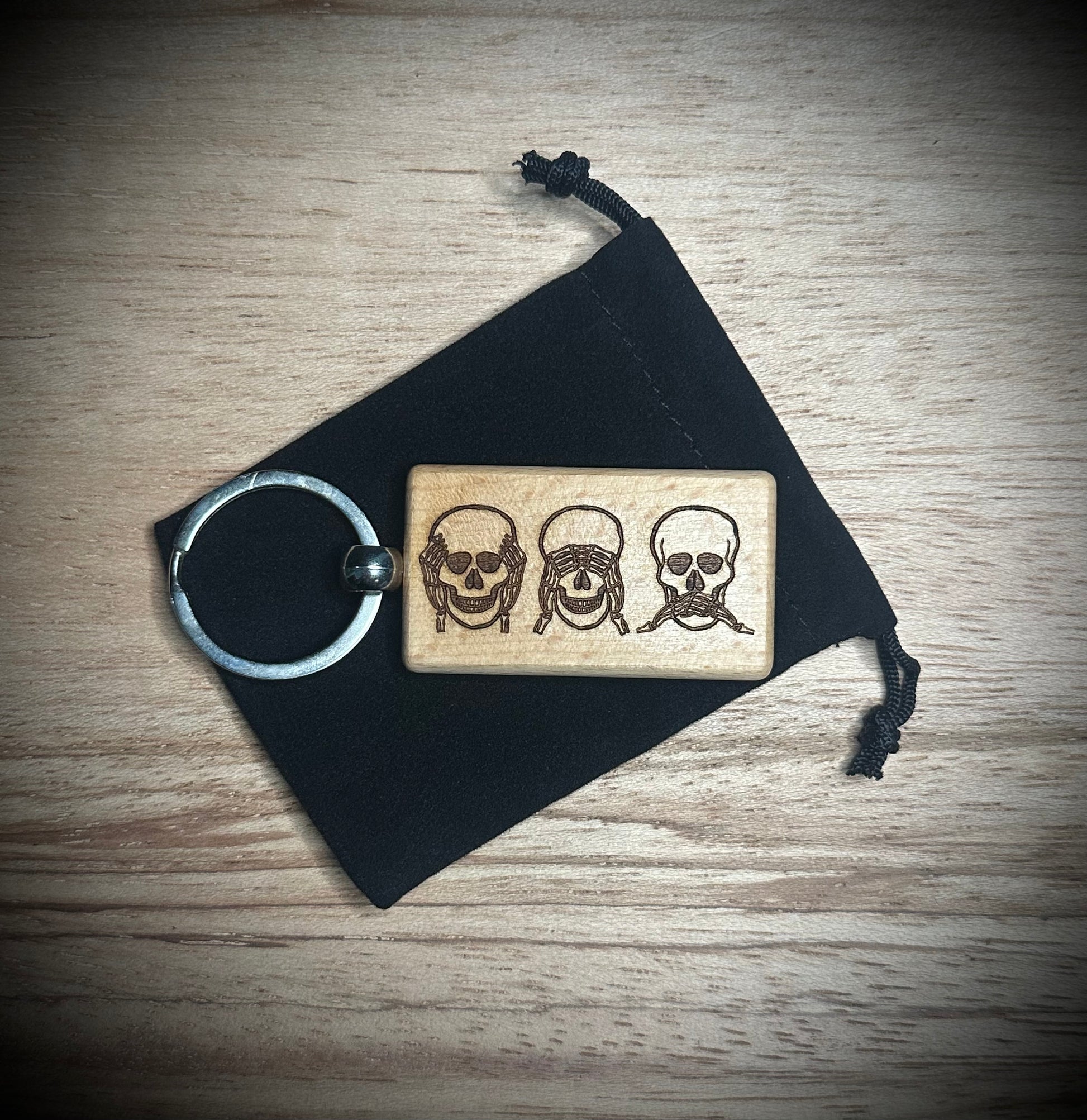 Rectangular wood keyring with Hear no Evil, See no Evil, Speak no Evil on one side and Immortal Flame Logo on the other. Finished with silver steel finishing.