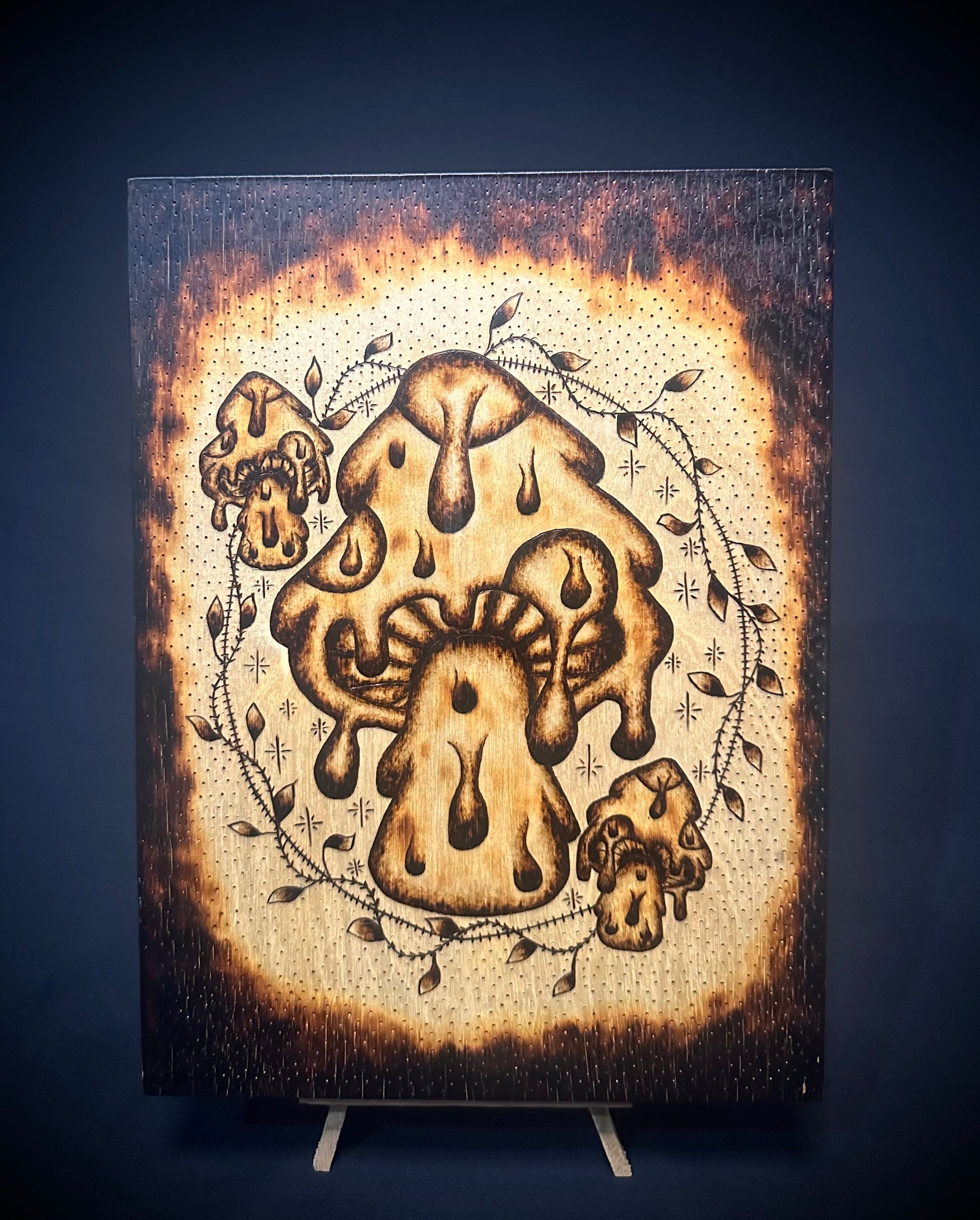 Birch and pinewood canvas. A hand designed and burnt artwork named Mushroom Wonderland.
