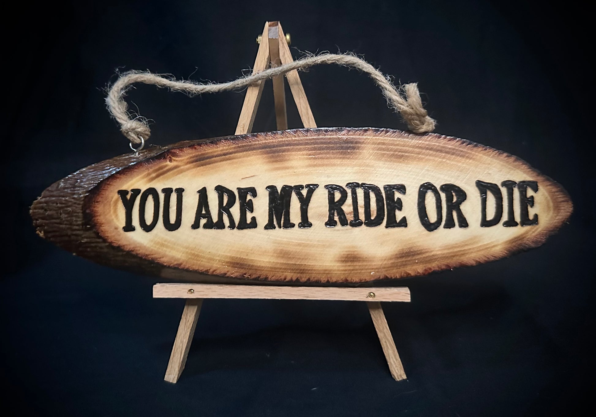 Crafted with a live edge wood oval and beautifully detailed rustic pyrography, our You Are My Ride Or Die wood sign adds a touch of warmth and rustic charm to any space. The natural wood grain and hand-burned design make each sign unique. Perfect for adding a cosy touch to your home décor.