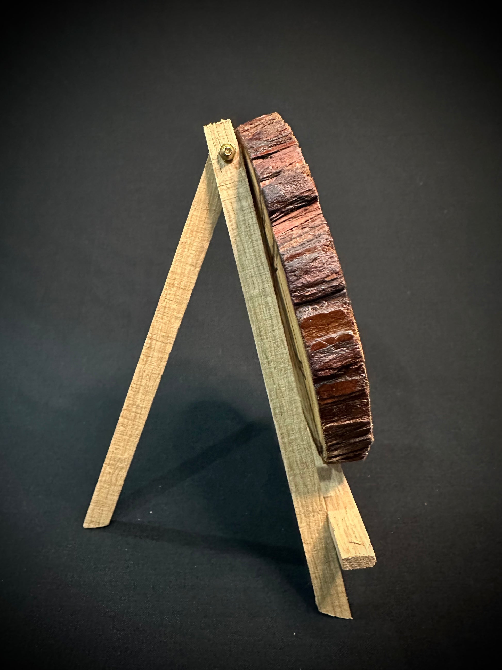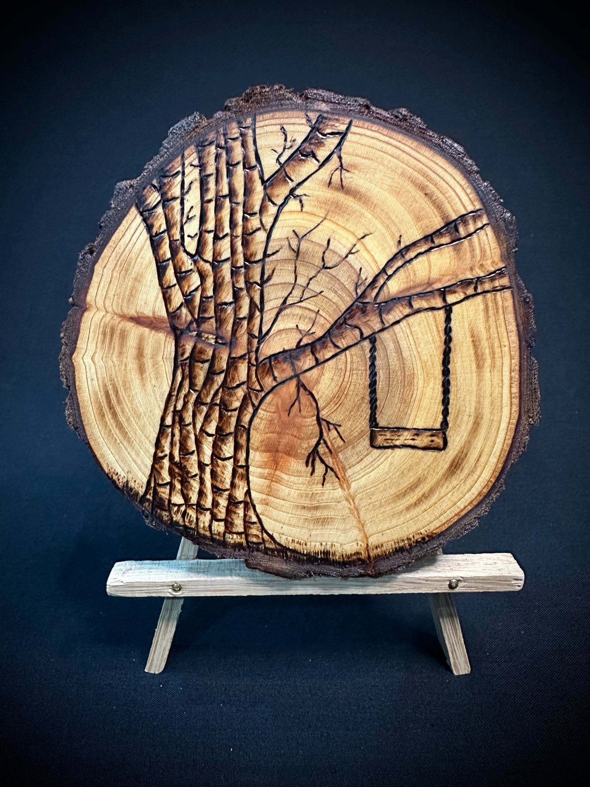 This handcrafted round wood piece, known as Swing, features a natural bark design and is coated in a clear Osmo satin finish with UV protection. Free of biocides, it is safe for humans, plants, and animals. Add a touch of nature to your space with this unique piece of art