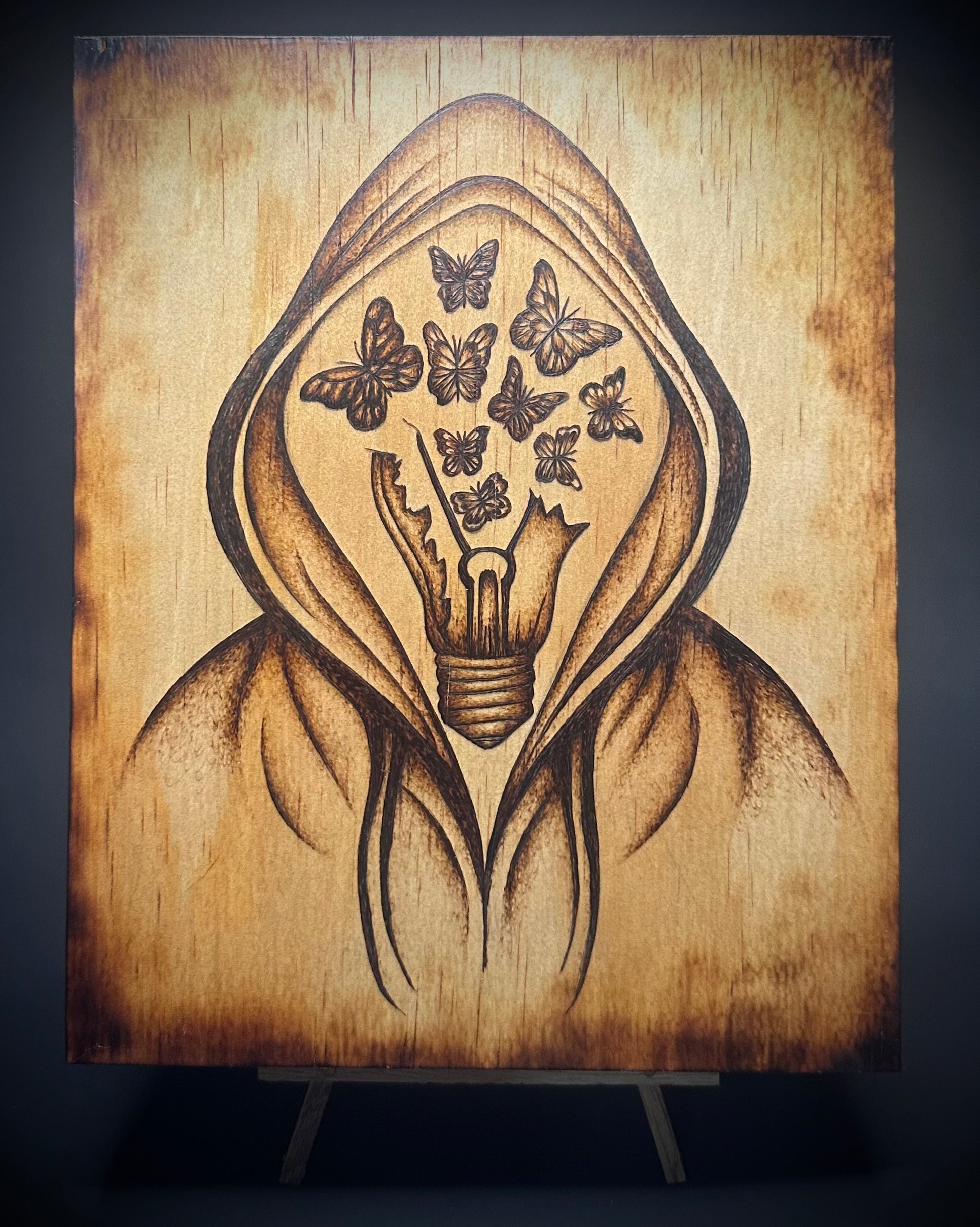 Birch and pinewood canvas. A hand designed and burnt artwork named The Freedom In Fracture.