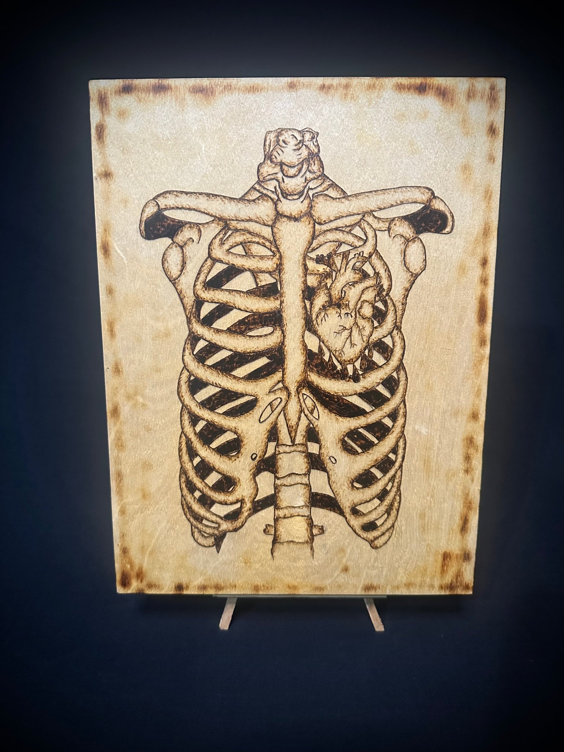 Birch and pinewood canvas. A hand designed and burnt artwork named The Rib Cage.