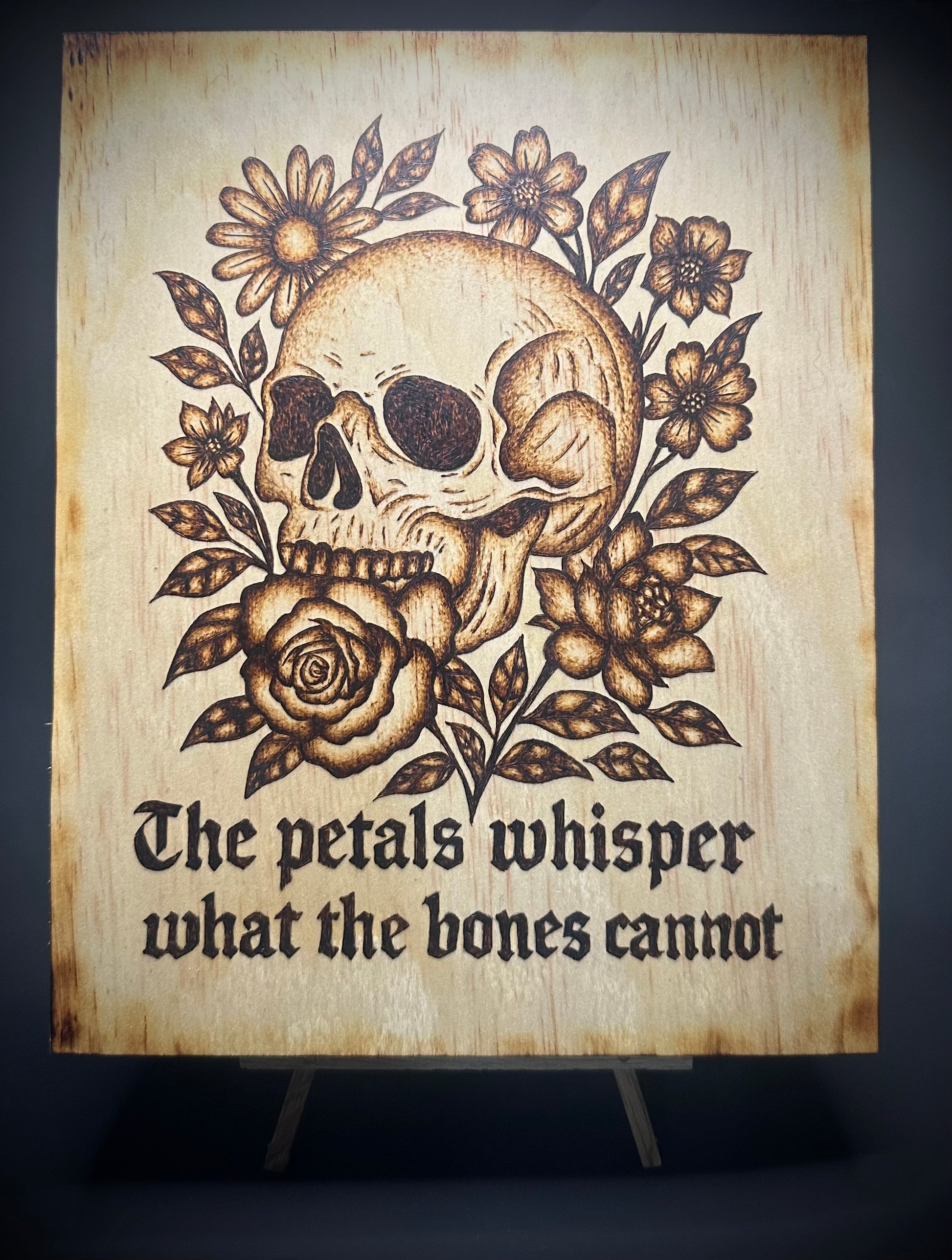 Birch and pinewood canvas. A hand designed and burnt artwork named Whisper.