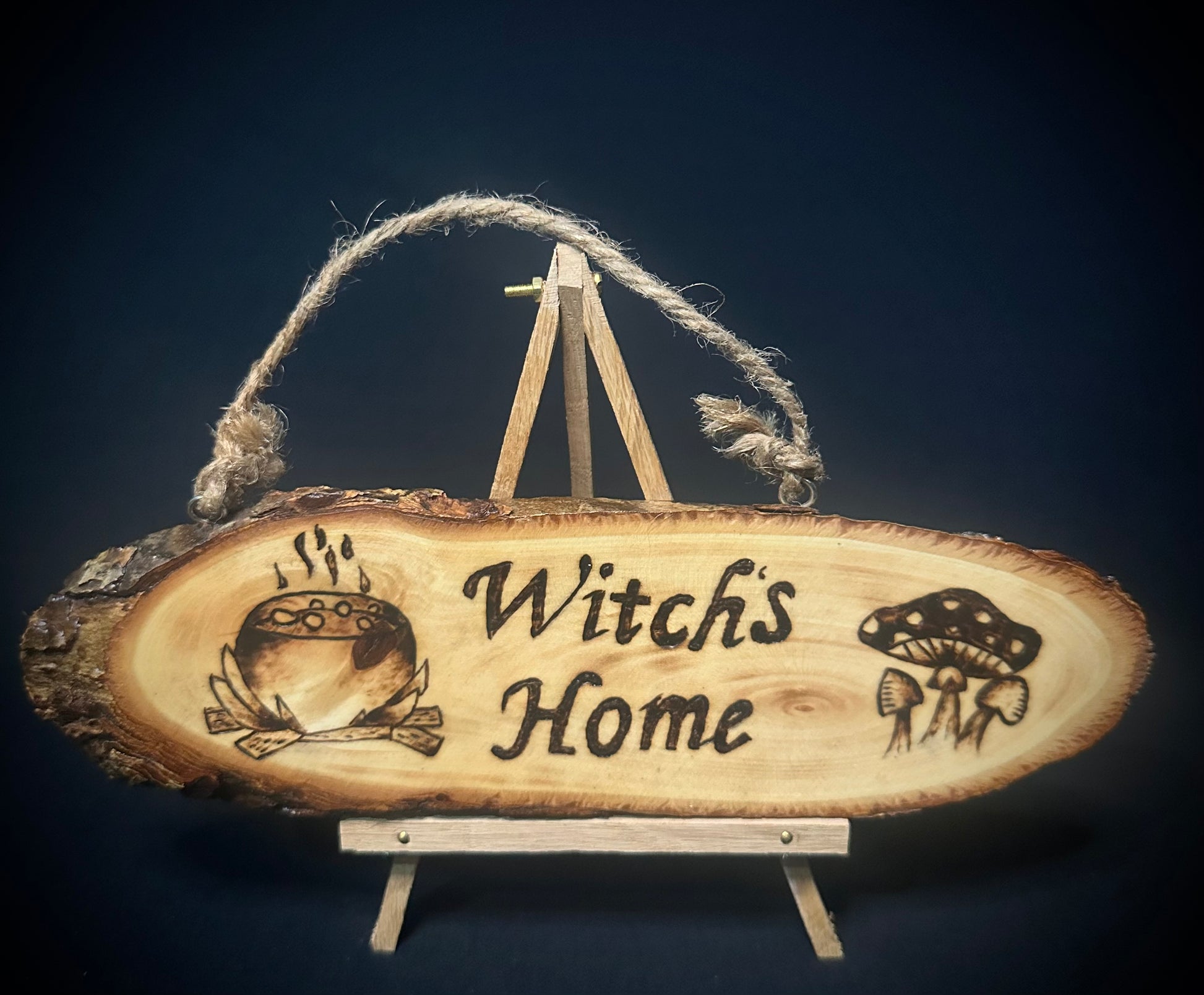 Crafted with a live edge wood oval and beautifully detailed pyrography, our Witches Home Sign adds a touch of warmth and rustic charm to any space. The natural wood grain and hand-burned design make each sign unique. Perfect for adding a cosy touch to your home décor.